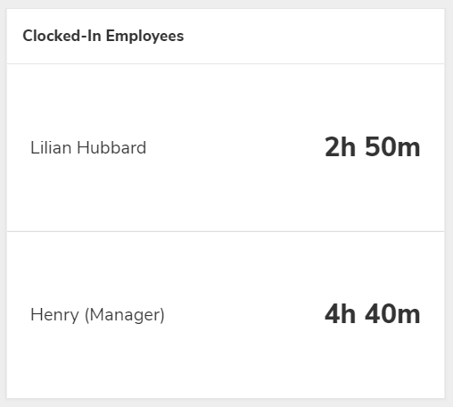 Displays a list of clocked-in employees and elapsed shift time. When the elapsed time is greater than 8 hours the text for that employee turns red to indicate that they may be receiving overtime pay.