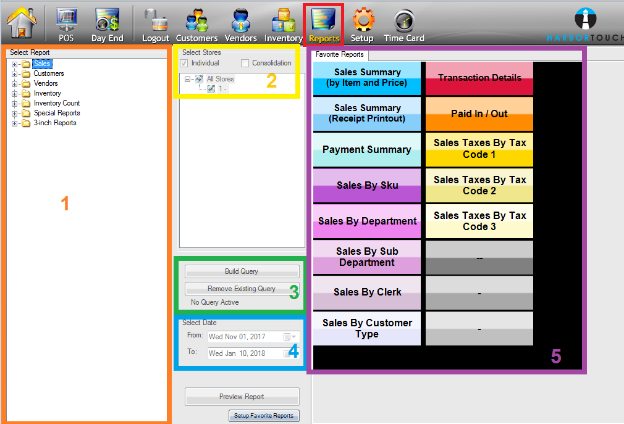 To access the Reporting Menu, log in to the system using administrator credentials and select Reports either from the home screen or the navigation bar at the top. Once on the screen, you can select the report, select stores, query, select the date, or favorite reports. These are explained in more detail below.