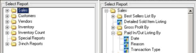 The HT-Retail software uses a folder system to organize the available reports. Clicking the "+" (plus sign) next to a folder will expand it and allow you to view the reports therein. Many of the folders will also contain subfolders within them that contain more specific report options. This is the primary way for users to navigate the reports found within the software.
