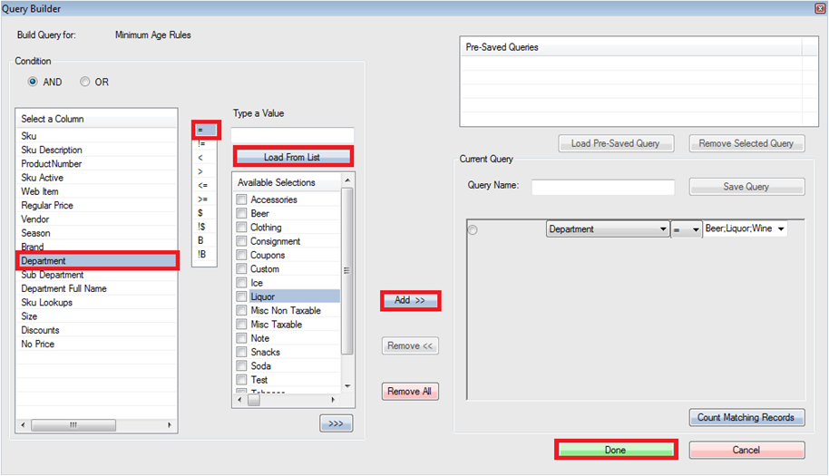 - Check off all departments that you would like the rule to apply to and press Add >> then Done to place it under Current Query.