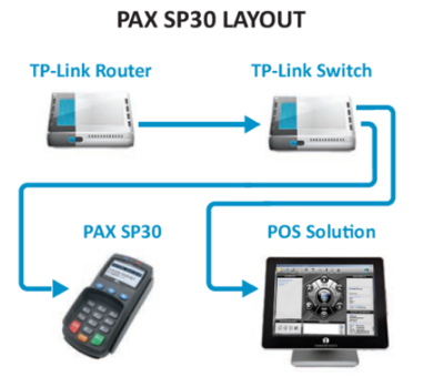 If an Ethernet cable is not in place to be directly plugged into the PAX device, a switch can be used in unison with an installed POS terminal (see below):