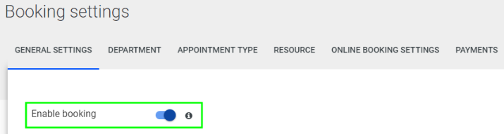 - Turn on the Booking feature by sliding the toggle for "Enable booking" to enable it.