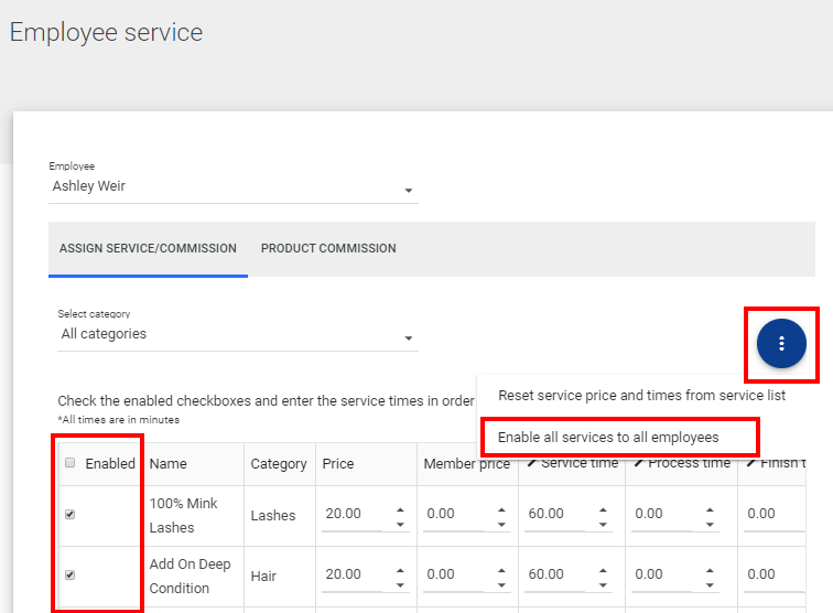 - Select the Menu button (blue circle with three white dots) and select Enable all services to all employees from the drop-down. **ONLY use this option if all services apply to all employees. **