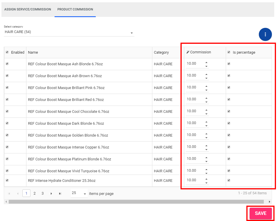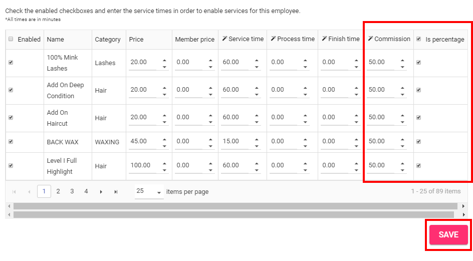 - To add a commission to a service for this employee, click Assign Service/Commission tab. First, you will need to ensure that the services being assigned a commission are enabled for that employee. This can be done in two ways:
