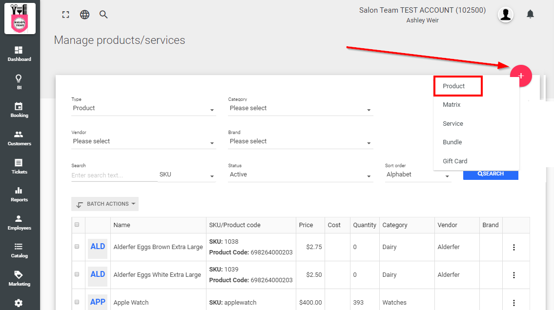 - To add a product, press the PLUS (+) button in the top right corner and select Product from the drop-down.
