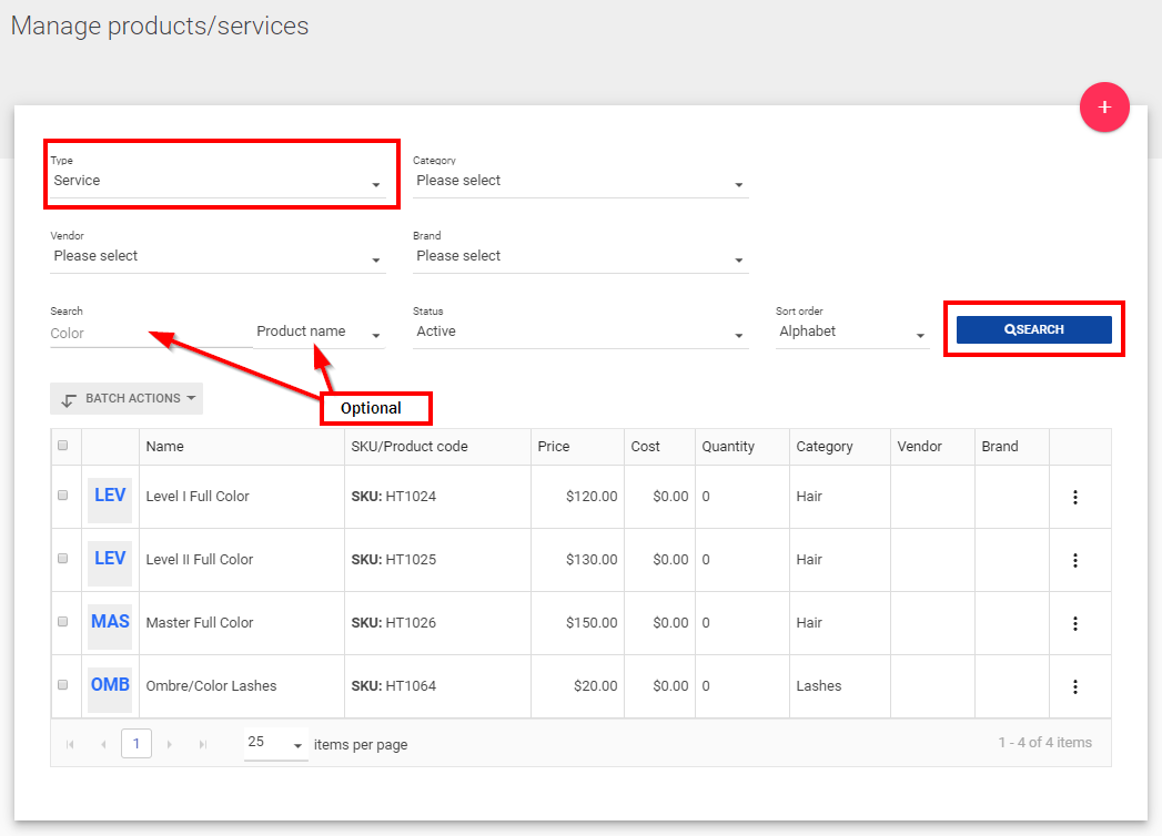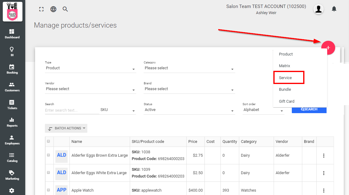- To add a product, press the PLUS (+) button in the top right corner and select Service from the drop-down.