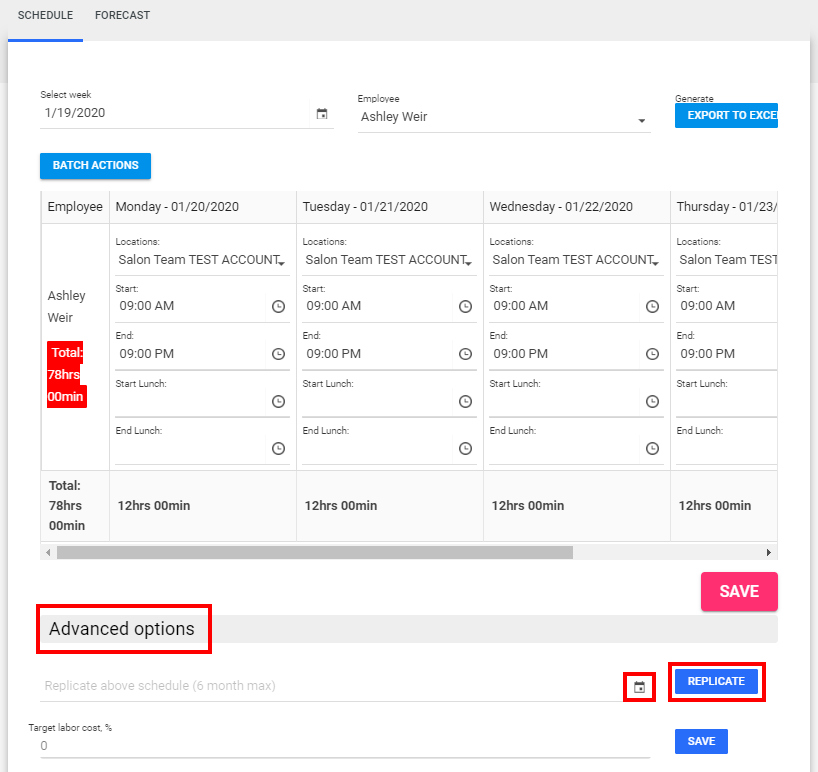 - Advance Options can be used to replicate a schedule for up to 6 months. Select Advanced options > Calendar icon on the bottom right.