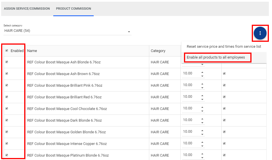 - Select the Menu button (blue circle with three white dots) and from the drop-down, choose Enable all products to all employees. **ONLY use this option if all products apply to all employees. **