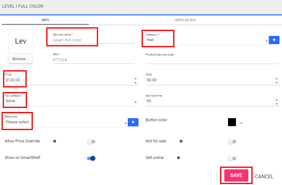- You need to enter info into all the required service name, category, price, tax category, service time, and resource fields. You don’t need to add a SKU, as one will generate. However, if needed, it can always be changed at any time.