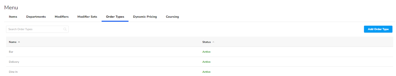 Note: SkyTab POS software is not capable of deleting or removing order types once they are in the POS system. The only way to remove or delete order types from the menu is to make them inactive.