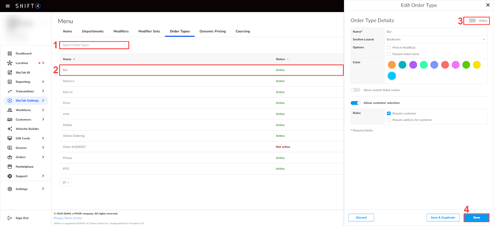 - On the Edit Order Type screen, slide the Active toggle OFF on the top right of the screen.