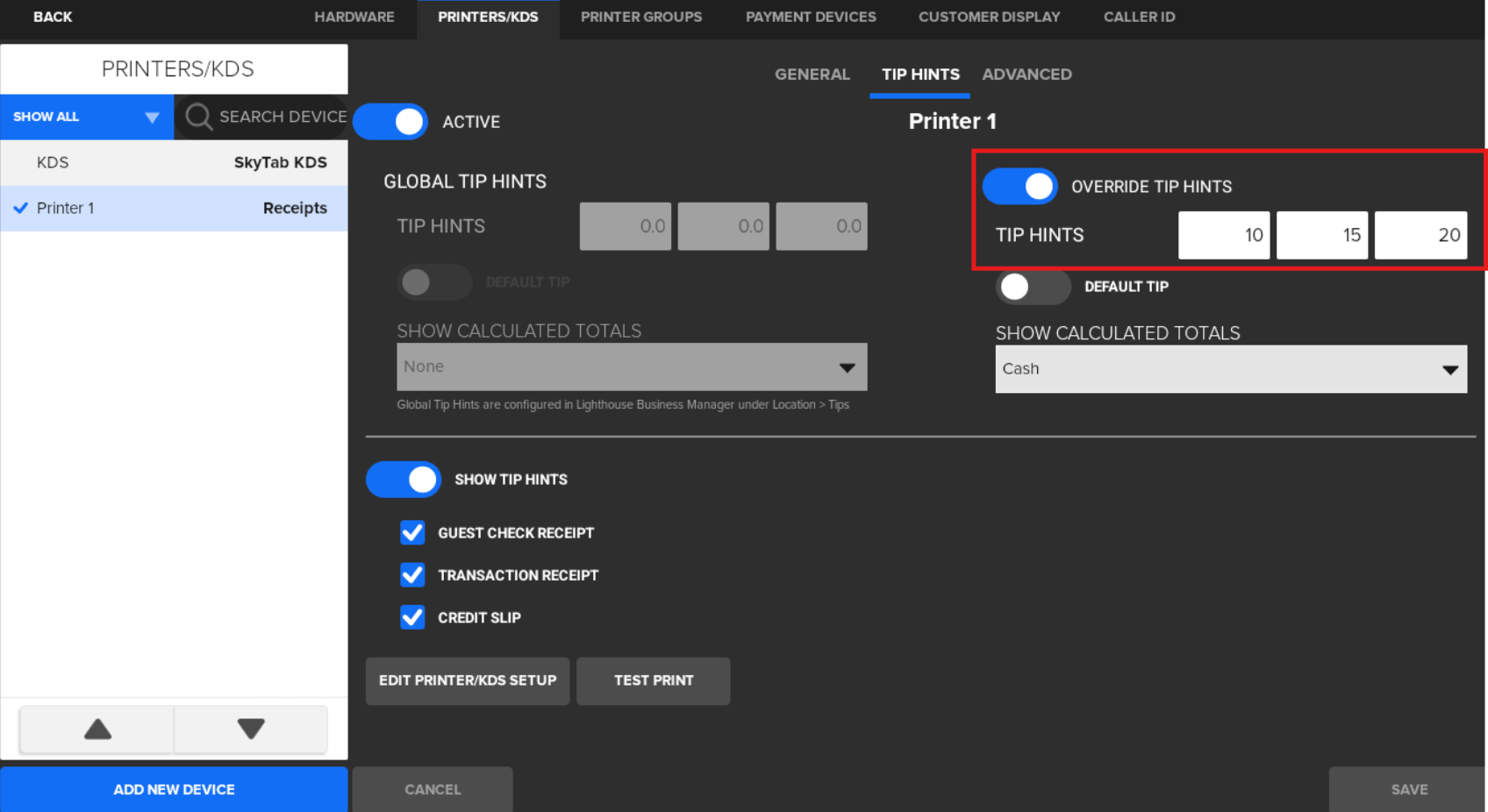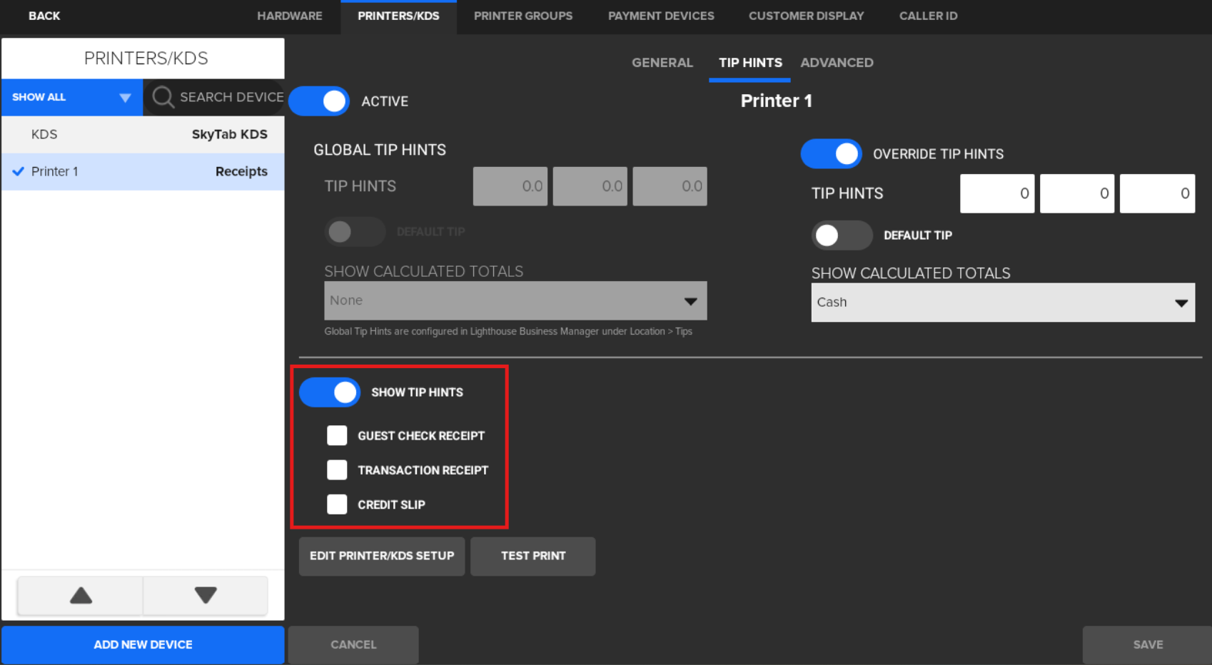 - Select the receipt printer where you want the tip hints to print, then select the Tip Hints tab.