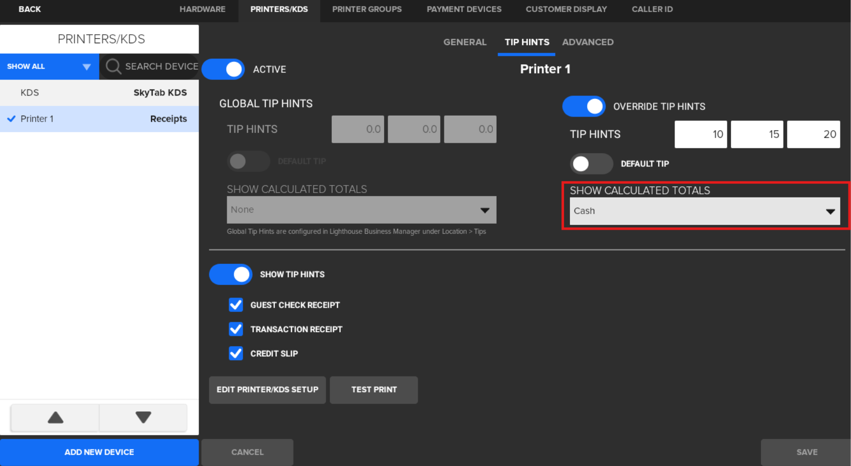 Note: If any fields are left blank, they will not appear on the receipt. The information displayed in the window will be presented on your receipt in the same order. - For Show Calculated Totals, select the dropdown for how the tip hints are calculated when using Advantage to allow calculating on either the Cash or Non-Cash totals.