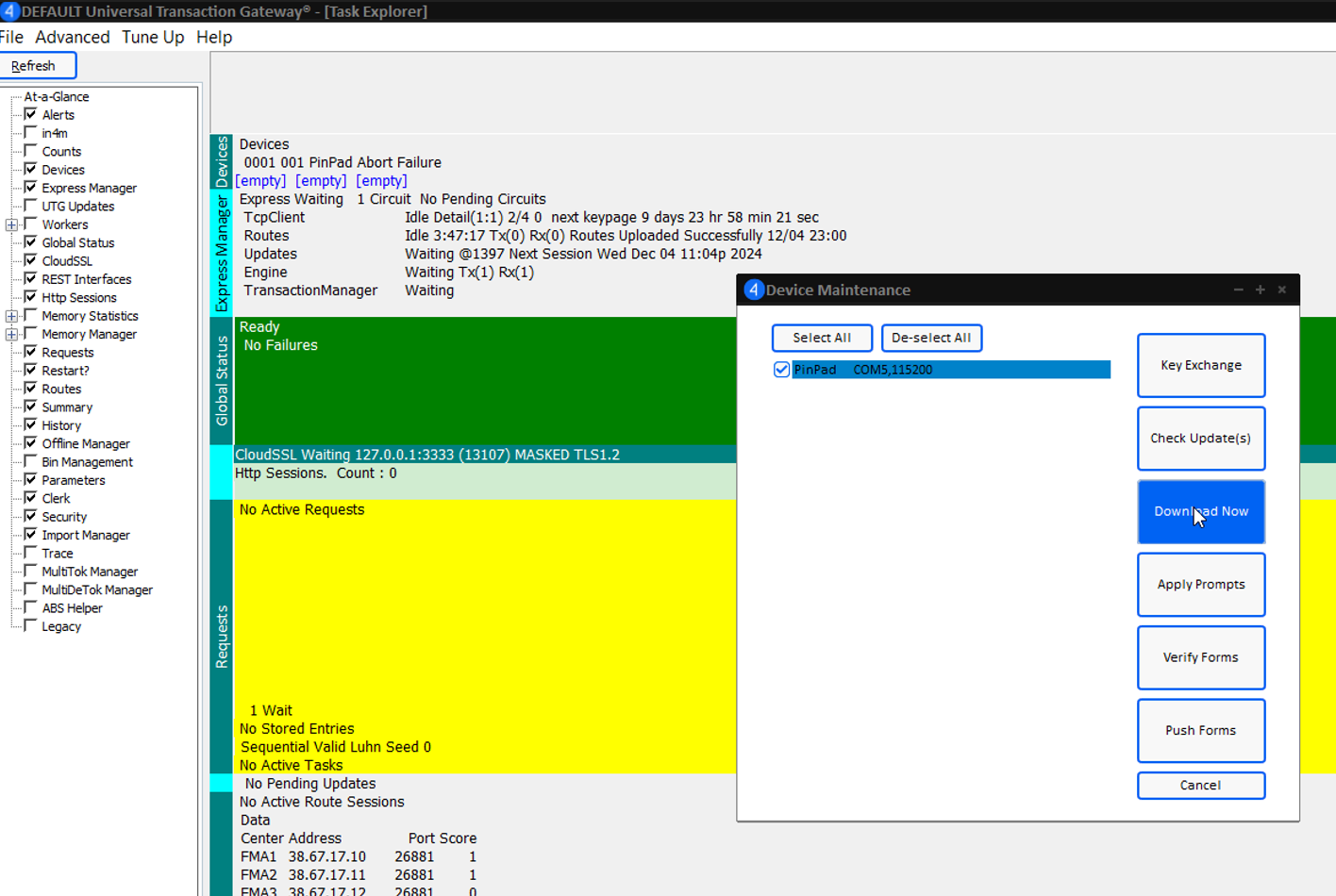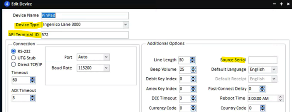 - Navigate to UTG TuneUp > Devices. Select the device and press View. Confirm the API Terminal ID and the Device Type, enter the Source Serial number, press Close, and then Save.
