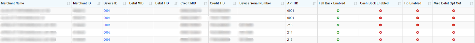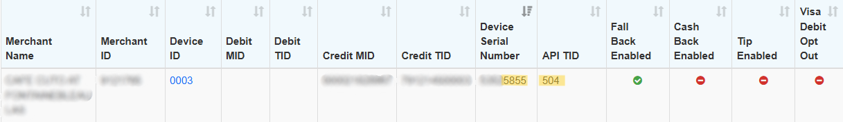 If the API Terminal ID is not listed, search for the needed venue and identify an empty slot. It is important to pay attention to the Merchant's Name. An available slot will be devoid of a device serial or API TID, indicating its availability. If a slot has an API Terminal ID but no device, first confirm that the terminal is not being used.