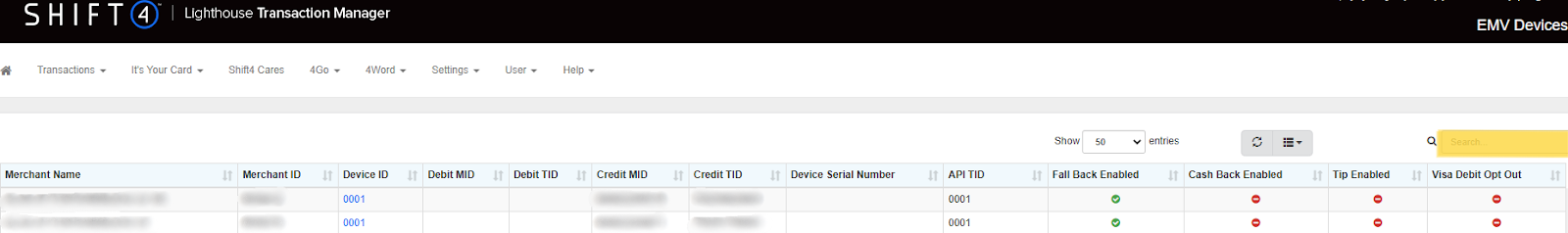 - Return to Lighthouse Transaction Manager. Search for the venue or API Terminal ID again. Confirm that the updated API Terminal ID with a device serial number is now visible.
