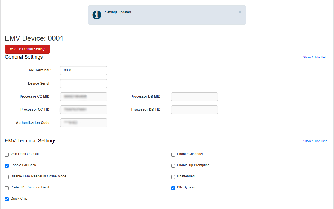 - Input the API Terminal number and leave the device serial empty. Scroll down to the bottom of the page and Save made changes.
