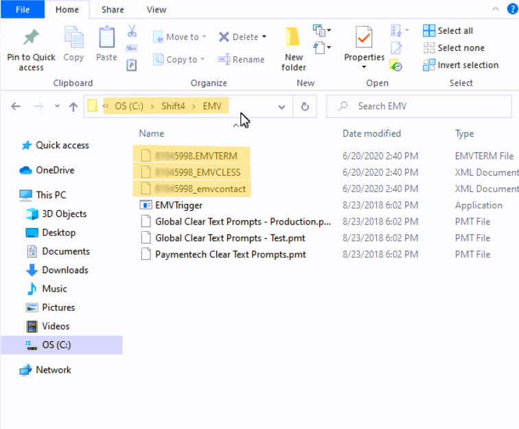 - Open File Explorer and navigate to C:\Shift4\EMV. Confirm that three files were downloaded with the device serial number, and proceed to test by performing a transaction.