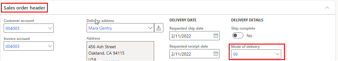 - Under Sales order header, make sure that a Mode of delivery is selected.