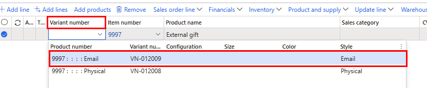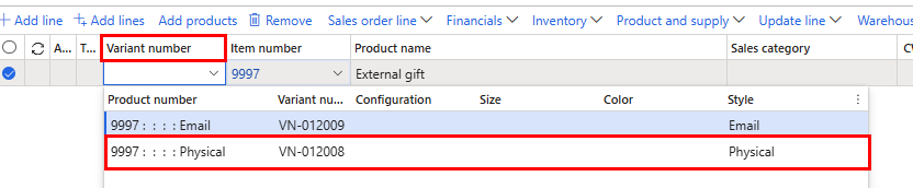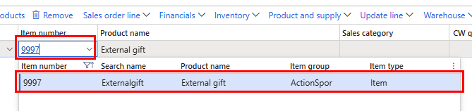 - In the Sales order lines add the External Gift card Item number, in our case this will be 9997.