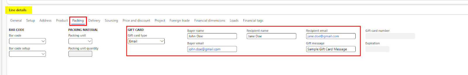 - Scroll down to Line details and navigate to the Packing tab. Ensure that the following information is filled out accordingly.