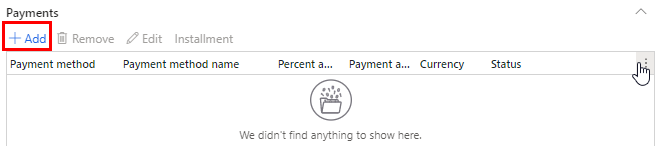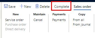 - Navigate back to the top of the page and select Complete to access the Sales order summary page, then under the Payments section, select Add.