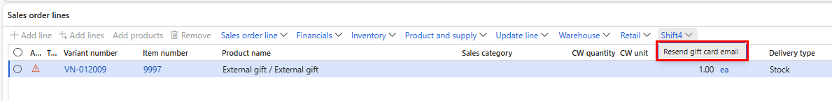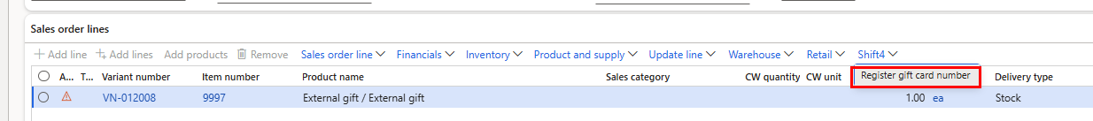 - Upon performing this action, the payment will be authorized to the Credit card chosen previously, and you will be brought back to the Sales order screen. At this point the Gift Card will need to be Registered to Shift4. To do so, navigate to the Sales order lines and select Shift4 > Register gift card number.