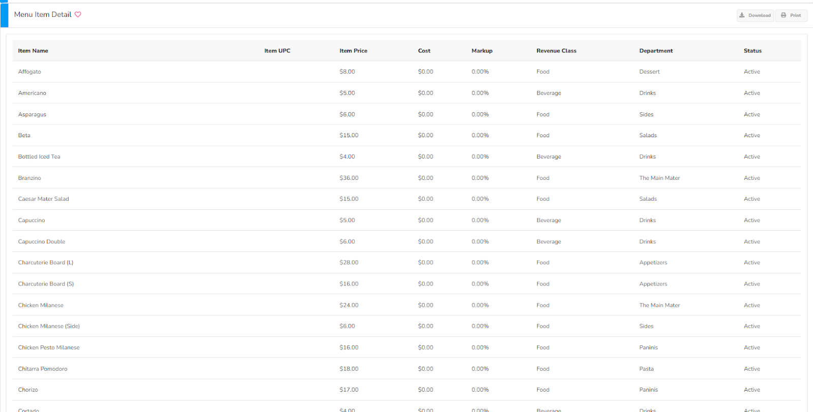 Menu Item Detail report displays the Item Name, Item UPC (Universal Product Code a.k.a Barcode), Item Prices, Costs, Markup, Revenue Classes, Departments, and Item Statuses.