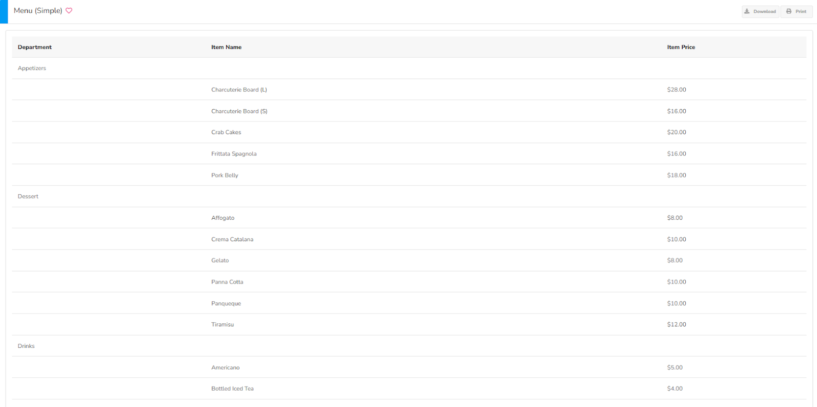 Menu (Simple) report displays Departments, Item Names, and Item Prices.