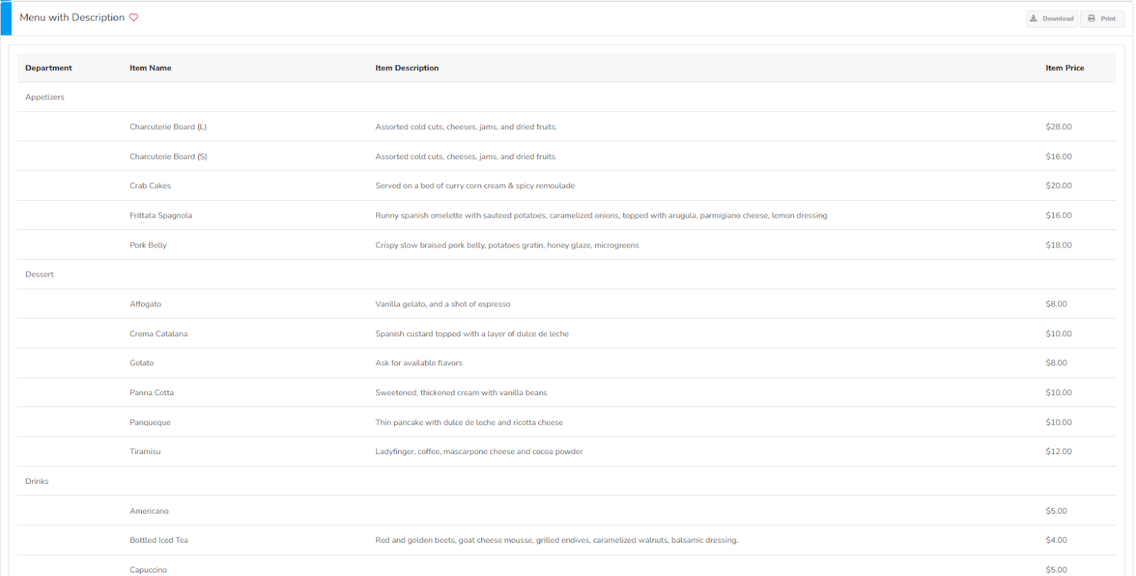Menu with Description report displays Departments, Item Names, Item Descriptions, and Item Prices.