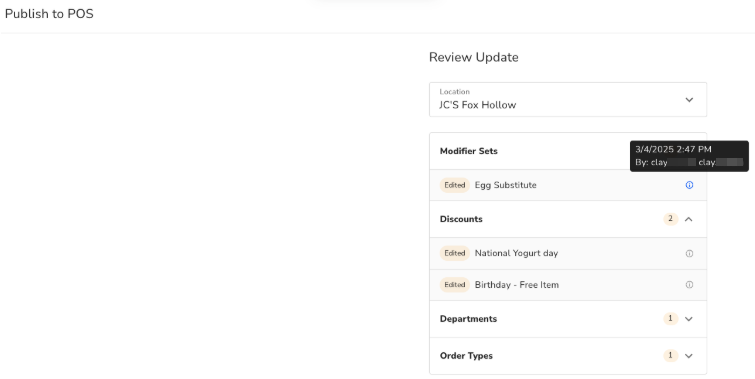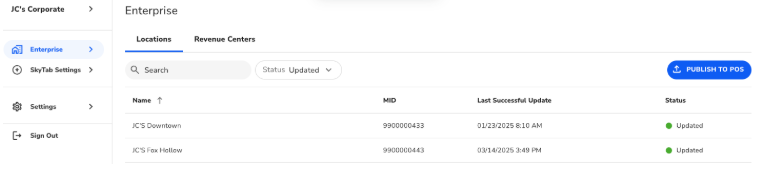 Changes made in SkyTab Multi-Location Management are saved to the Shift4 cloud but are not immediately pushed to POS stations. They are published to POS through one of three methods: