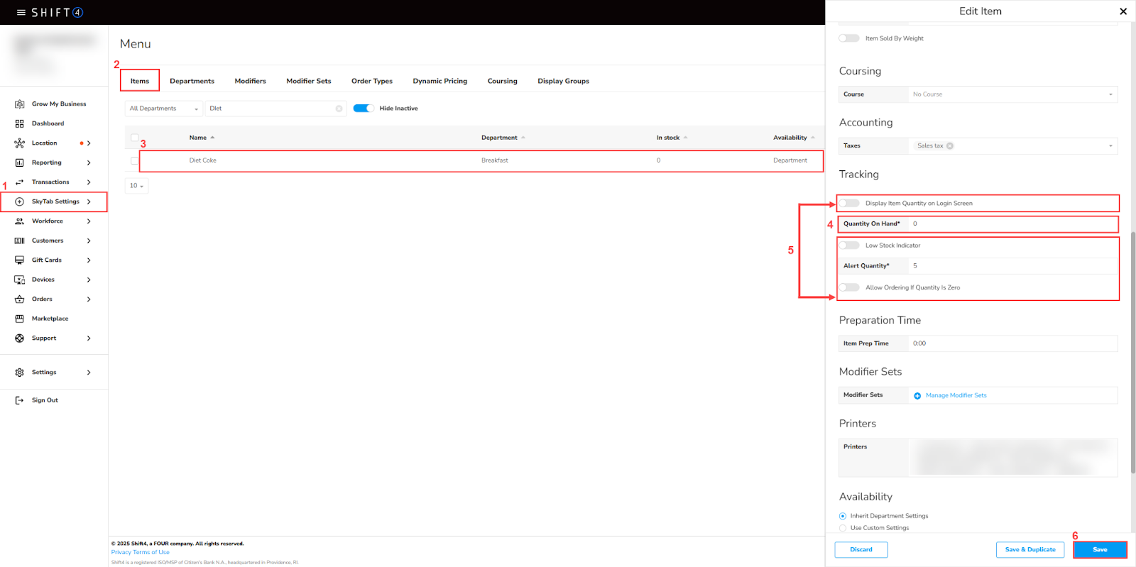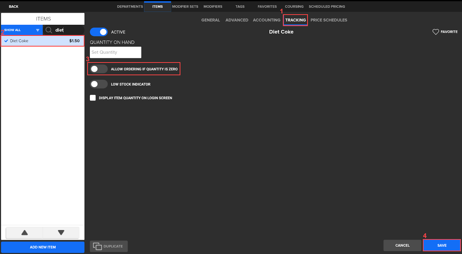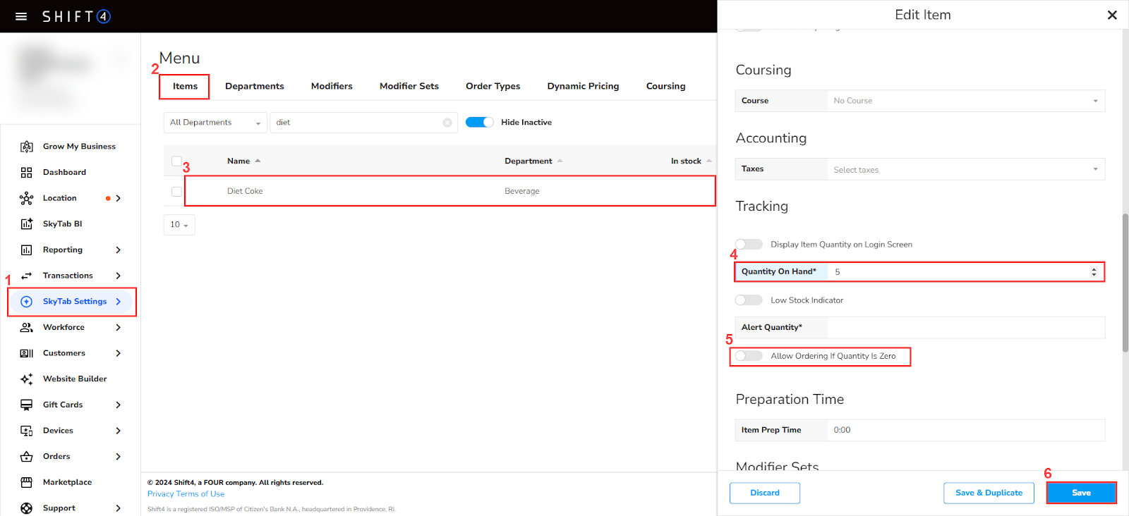 - Slide the toggle off (gray) for Allow Ordering if Quantity is Zero. This will show the item as "Sold Out" on SkyTab POS Ecosystem devices (SkyTab POS, SkyTab Glass, SkyTab Mobile).
