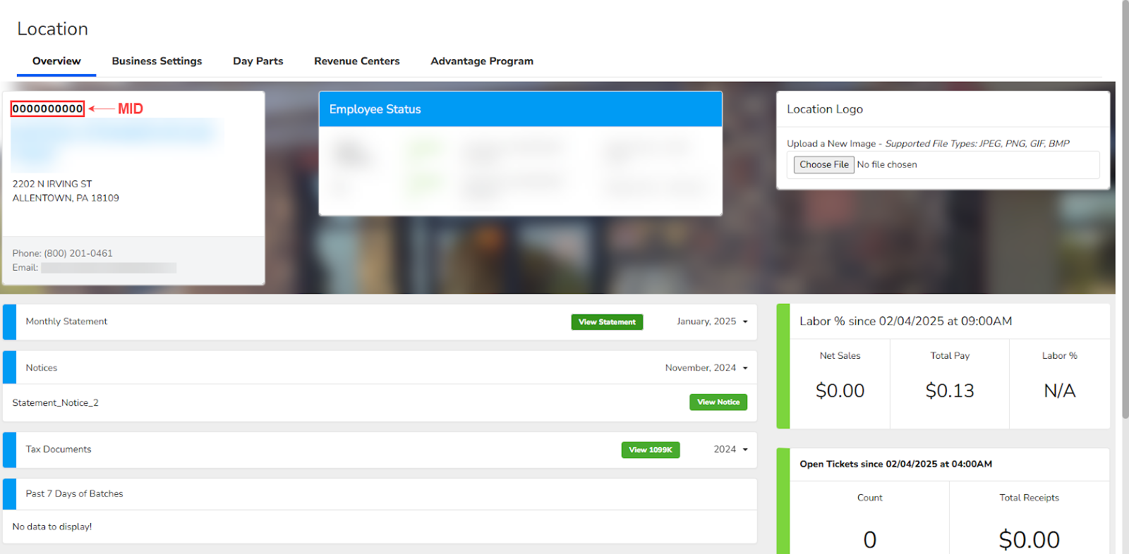 The merchant number can also be located in Lighthouse Business Manager > Location Overview as shown in the screenshot below.