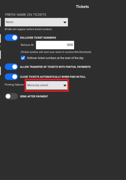 - Modify the “Printing Options” by navigating to Manager > Settings > Tickets. To resolve this issue, select either Do not print or Automatically print option.