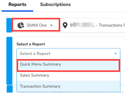 - For Shift4 One, under Select a Report, choose Quick Menu Summary.