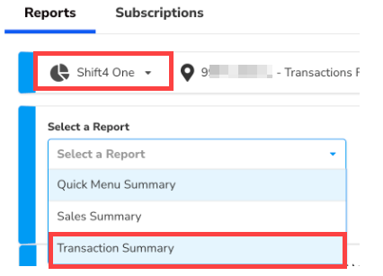 - For Shift4 One, under Select a Report, choose Transaction Summary.