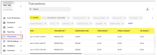 When reviewing reporting, cumulative totals typically appear based on the transactions available within LBM. For example, a listing of transactions filtered by a specific time period can show a column titled Tip Amount, which would be totaled to provide a Tip Summary total visible on the Financial Overview report.