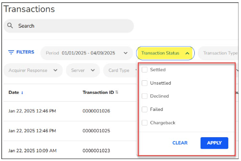 Within LBM, select one or more of the available filters to determine the quantity of transactions that will appear. The following represents the selections available within Transaction Status.