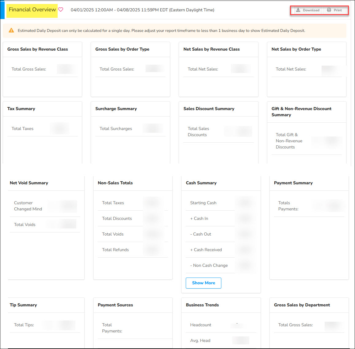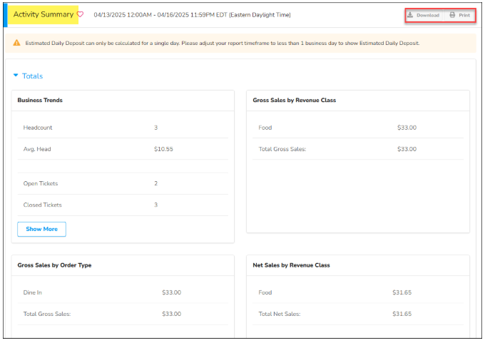 Important: Estimated Daily Deposit can only be calculated for a single day. The report timeframe should be adjusted to less than one business day.