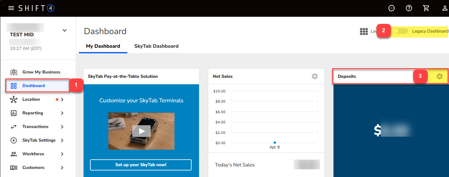Note: From the dashboard (1), after determining the proper layout (2), select the gear icon (3) on the Deposits widget for any additional settings.