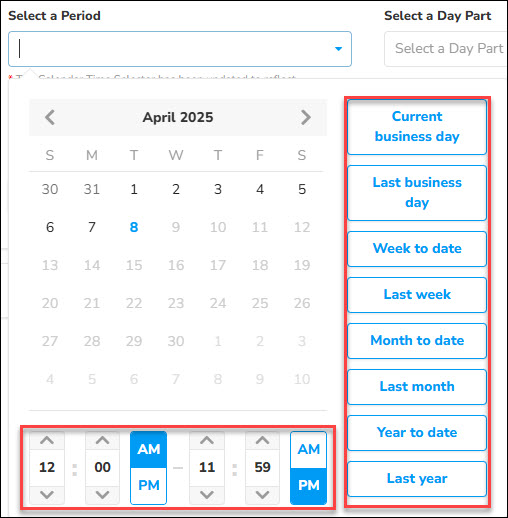 - Ensure the correct report settings (e.g., date range, date part, revenue center, business default time)