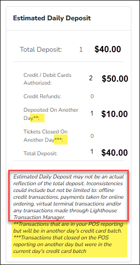 For amounts deposited on another day, since the report just gives the number of transactions for another day, review the Transaction Report (e.g., when the ticket was opened/closed) to determine why these transactions were not included (e.g., ran after the batch closed or ticket was not closed).