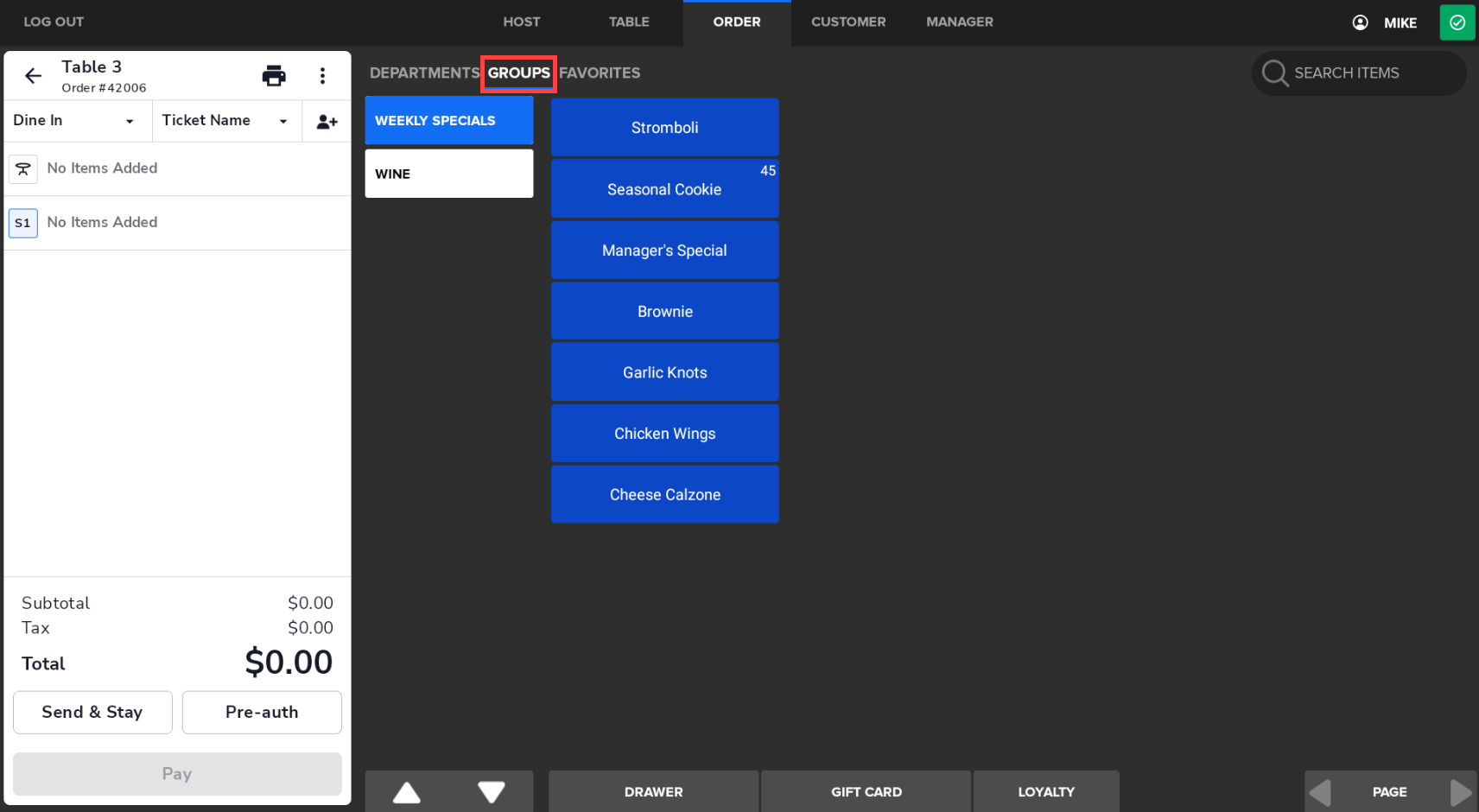 - Open a ticket and enter Order Entry. Tap the Groups tab to view available Display Groups.