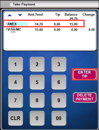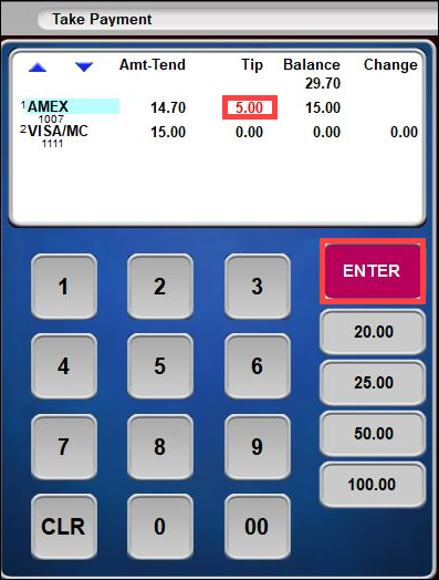 - After authorizing a credit card (or multiple cards) and going to the payment screen, you will see the credit card types listed as well as the last four digits of the card used. To add the tip, select the credit card and then select the Enter Tip button.