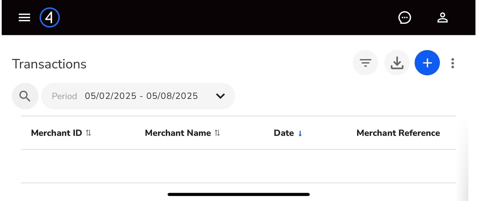- On the All Transactions page, select the blue + button in the top right corner to open the Virtual Terminal.