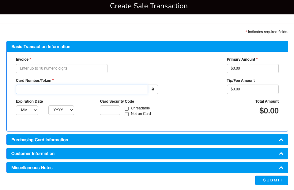Note: Access to the Virtual Terminal feature is based on your user permission levels, which are set by your LBM admin. If you do not see the blue (+) button, you may not have the necessary permissions. Please contact your LBM admin for assistance. - In the Virtual Terminal view, fill in all the required transaction details.