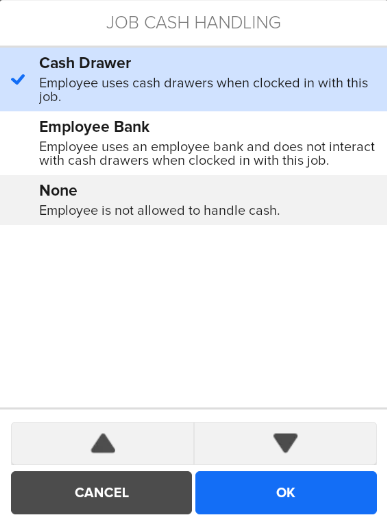 - If the issue persists, navigate to the Manager > Settings > Users > Jobs, select the job that is getting the error when processing the ticket, and ensure that Job Cash Handling is NOT set as None. If it is, select Cash Drawer or Employee Bank, based on how the job is operating in the location, and select the blue OK button.