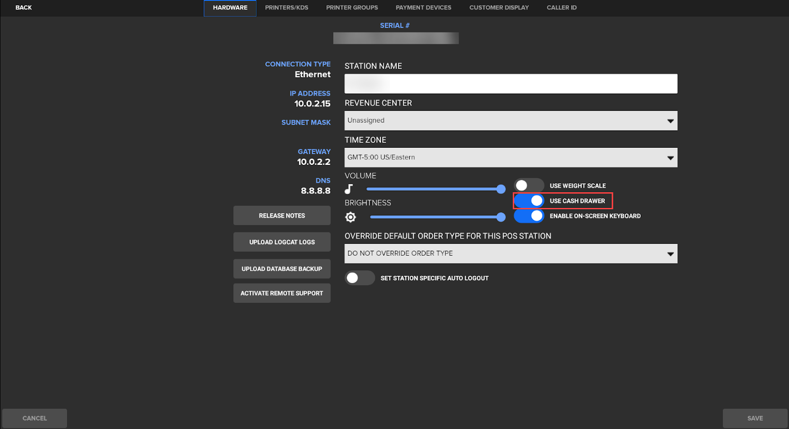 - Navigate to the Manager > Settings > Hardware and ensure the "Use Cash Drawer" toggle is enabled.