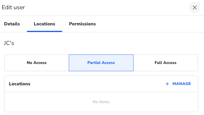 - No Access: The user will have no access to the Enterprise or its locations. These are hidden from the navigation menu.