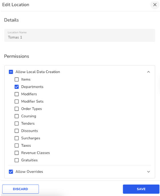 - On the Edit Location screen, open the "Allow Local Data Creation" dropdown and select the appropriate checkbox based on the data type (Items, Departments, Modifiers, etc).